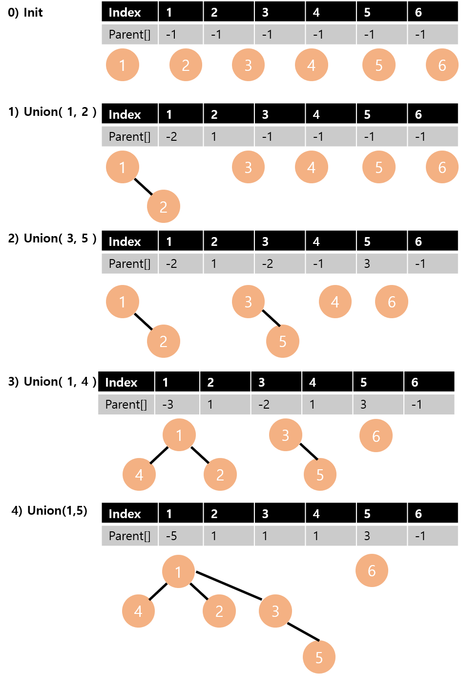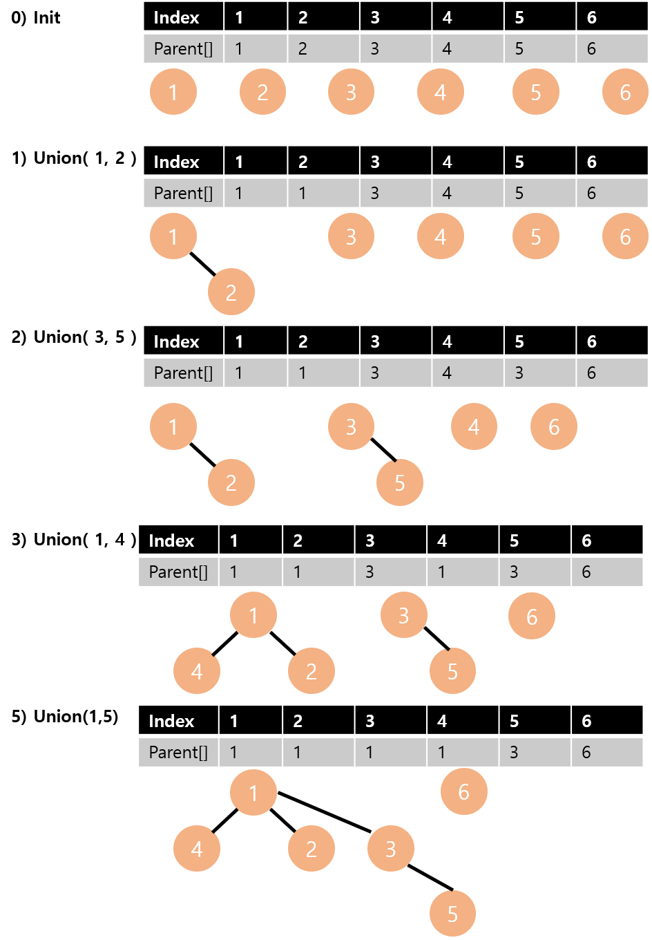 위의 예시를 parent 배열까지 함께 나타내며 다시 보겠습니다.