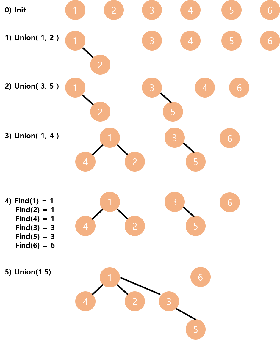 Union(x, y) := x가 속한 집합과 y가 속한 집합을 합집합 해줍니다. 따라서 먼저 x와 y 노드의 루트 노드를 find 하고 그 둘이 다르다면(다른 집합이라면) 하나의 루트 노드를 다른 루트 노드로 새롭게 갱신해주면 됩니다.