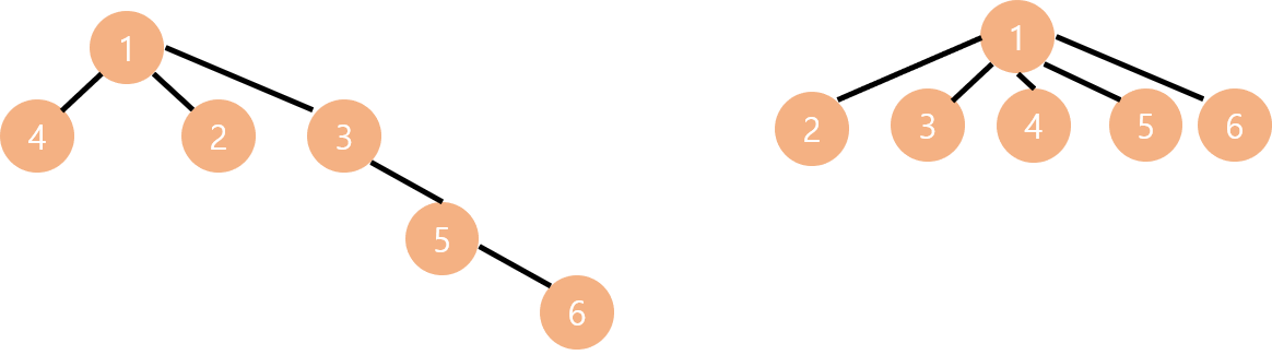 예를 들어 위와 같이 같은 Set을 나타내는 트리가 있다고 해봅시다. 이때 find(6) 을 수행하려면 왼쪽 트리는 루트 노드(1)을 찾기 위해 탐색을 여러 번 수행해야 하고, 오른쪽 트리는 단 한 번에 탐색을 끝낼 수 있습니다. 지금이야 원소가 6개뿐인 집합이라 탐색 횟수가 많이 차이 나지는 않지만, 트리가 커지면 커질수록 이 차이는 점점 커지게 됩니다. 따라서 우리는 트리의 노드들을 최대한 루트 노드와 직접 연결시켜야 합니다.