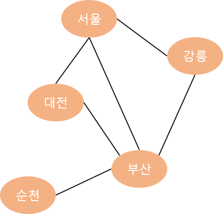 그래프(graph)는 연결되어 있는 객체 간의 관계를 표현할 수 있는 자료 구조입니다. 수학자 오일러에 의해 처음 창안되었으며, 정점(vertex)와 간선(edge)로 그래프를 표현합니다. 정점은 노드(node)라고도 불리며, 간선은 링크(link) 라고도 불립니다. 아래 그림과 같이 지도를 나타낼 때 그래프가 많이 이용됩니다.