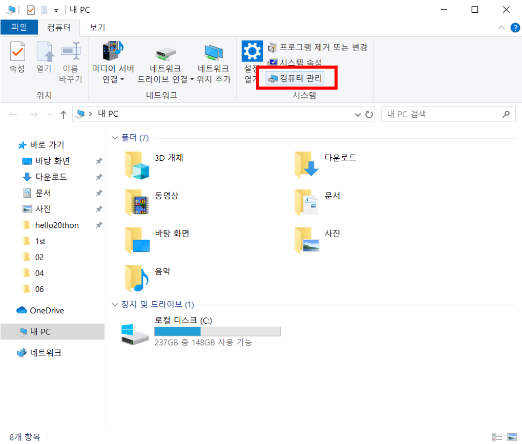1) 내PC -> 컴퓨터 관리를 누른다.