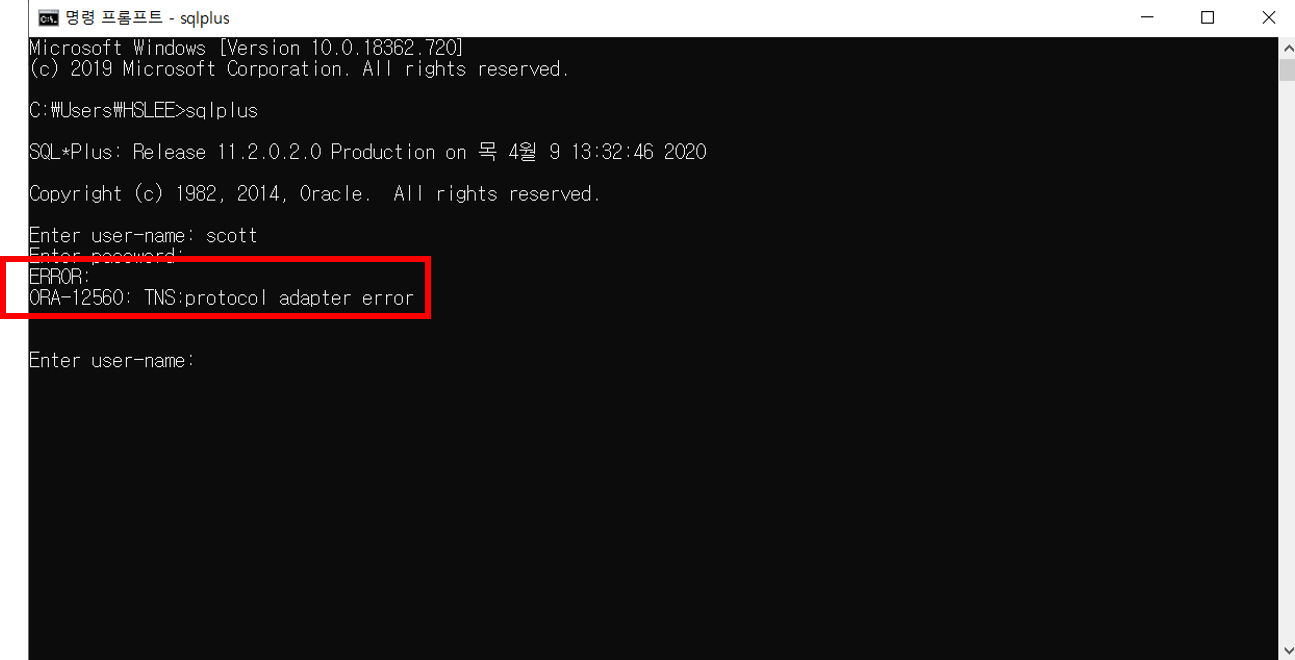 Oracle DB에 접속하기 위해 sqlplus에 로그인하려는데 user-name, password를 맞게 입력해도 ERROR : ORA-12560 : TNS:protocol adapter error 가 발생했다. user-name, password 를 잊어버린 게 아닌가 싶은 생각에 관리자로 접속해서 user-name, password 를 바꾸는 명령어도 입력해보았지만 계속 에러가 발생했다.